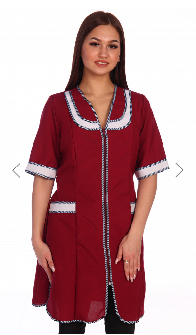 Халат женский укороченный прямого силуэта с центральной застежкой на молнию. Полочка с двумя нижними накладными карманами и разрезами по боковым швам, спинка без отделки. Рукав короткий, втачной. Объем талии регулируется двумя полупоясами. Все срезы халата обработаны капроновым кантом. Для увеличения прочности халата выполнено дополнительное усиление швов центральной застежки и карманов. Халат предназначен для защиты от общепроизводственных загрязнений .