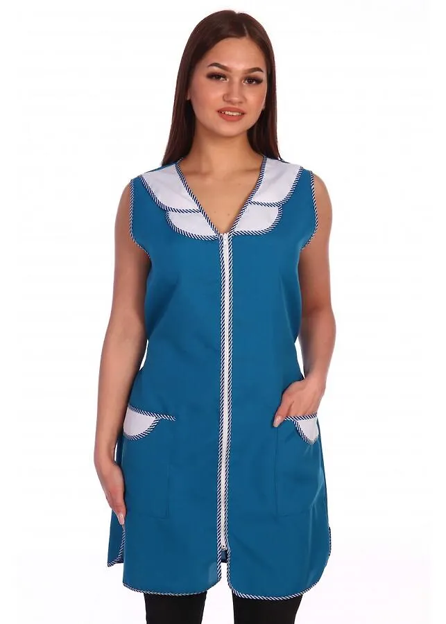 Халат от производственных загрязнений из синтетической ткани.Халат женский прямого силуэта на молнии, с 2 накладными карманами без рукавов, срезы халата обработаны закрытым кантом.Халат для сферы услуг, для клининга, для продавцов.