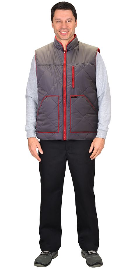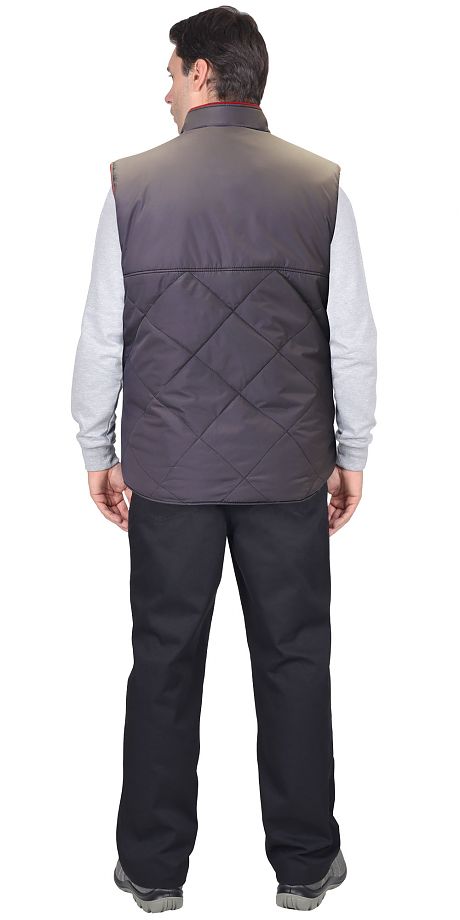 Жилет утеплённый, стёганный, прямого силуэта, на подкладке из флиса с центральной бортовой застёжкой на молнию, с воротником стойка, с нагрудным карманом с молнией и нижними фигурными утеплёнными карманами. Жилет с удлинённой спинкой. ГОСТ 25295-2003