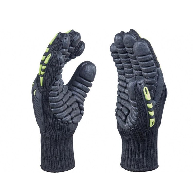Антивибрационные трикотажные бесшовные перчатки. На ладони и пальцах - защитная накладка из хлоропреновых резиновых подушечек (0.8 см толщиной) для защиты от вибрации. Дополнительные гибкие рельефные накладки из неопрена на тыльной стороне перчатки и пальцах. Устойчивость к ударному воздействию в области запястья.