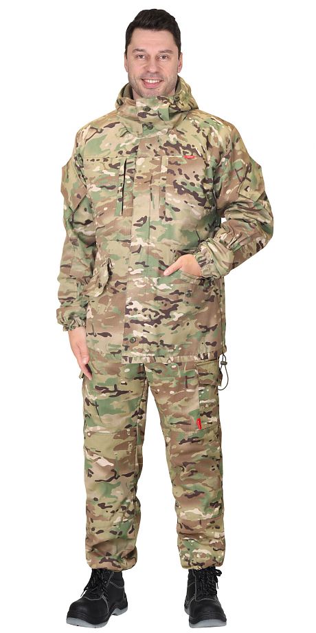 Куртка прямого силуэта, с центральной супатной застежкой на пуговицы, нижняя петля сквозная, с верхними карманами листочка на «молнию», с нижними карманами «листочка» с настрочными концами и фигурным клапанами на пуговицу, с внутренним карманом на «молнию». Рукава с полу объемными накладными карманами и фигурными клапанами на «липучку», с притачной нижней деталью на резинке, с налокотниками. Капюшон с козырьком, кулисами для регулировки, застежкой на пуговицы. По талии и низу куртки регулирует шляпной резинкой и фиксатором.Брюки с застежкой гульфика на пуговицы, пояс цельнокроеный на пуговицу, со шлевками, с резинкой по всей ширине цельнокроеного пояса, со съ.мными бретелями, с карманами в боковых швах, с задними накладными карманами застегивающиеся на пуговицу, с накладными карманами с объ.мом на боковых швах с фигурными клапанами на пуговицу, с наколенниками. Понизу брюк пуфта с завязками.ГОСТ 25295-2003 Ткань смесовая «Рип-Стоп» 65% п/э, 35% х/б. Подкладка: «Флис» 100% п/э.