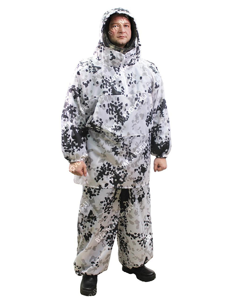 Маскировочный костюм состоит из куртки и брюк. Куртка с капюшоном, есть два боковых кармана. Рукав на резинке. Костюм предназначен для маскировки на заснеженной местности. Идеально подходит для охоты в зимнее время. Одевается на любой вид одежды и обеспечивают максимальную маскировку в лесу. ГОСТ 25295-2003