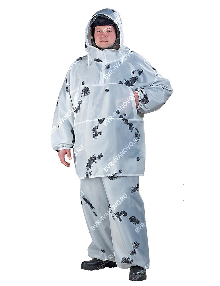 Маскировочный костюм "Клякса" состоит из куртки и брюк. Куртка с капюшоном, есть два боковых кармана. Рукав на резинке. Костюм предназначен для маскировки на заснеженной местности. Идеально подходит для охоты в зимнее время. Одевается на любой вид одежды и обеспечивают максимальную маскировку в лесу. ГОСТ 25295-2003