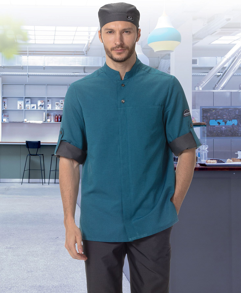 Блуза мужская прямого силуэта с центральной застежкой на потайные кнопки и 2 верхние джинсовые пуговицы для пристегивания фартука.