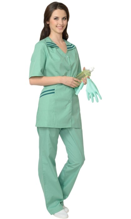 Описание: Тк. смесовая, 65% п/э, 35% х/б, 120 г/кв.м. Куртка с застёжкой на пуговицы, короткими рукавами, с отделкой по воротнику и нижним карманам. Брюки с резинкой. ГОСТ 9896-88, ТО.