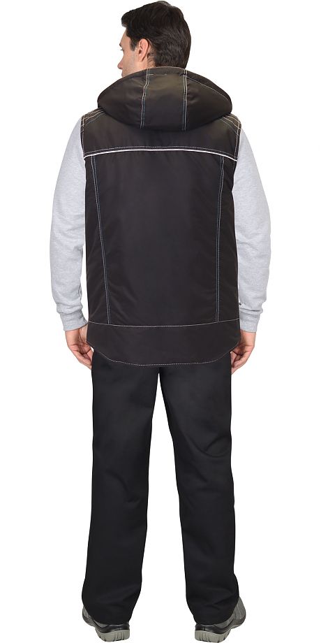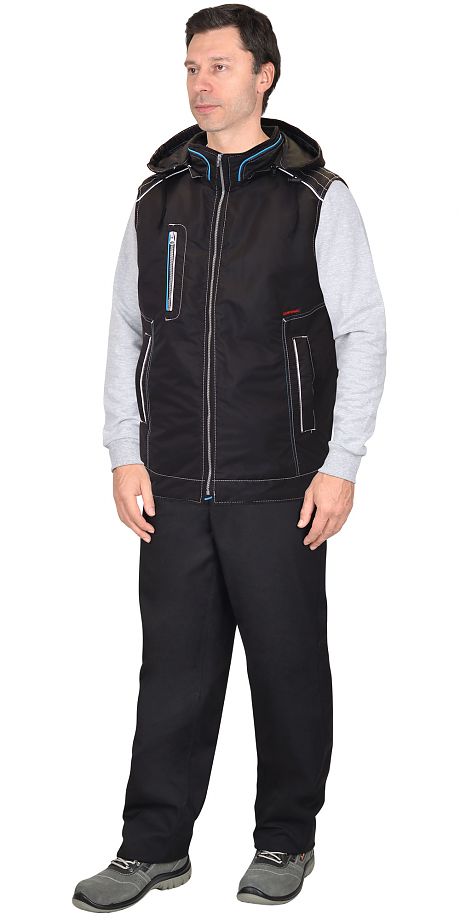 Жилет прямого силуэта утепленный с капюшоном, пристегивающимся на молнию; с застежкой до верха; воротник - стойка с отделочной деталью и кантом; полочка с двумя нижними прорезными карманами "листочка" и одним прорезным карманом "в рамку" на молнии (на правой полочке); на деталях жилета выполнены декоративные отделочные строчки белого и синего цвета; с внутренней стороны на левой полочке расположен внутренний накладной карман на молнии; спинка удлинена.