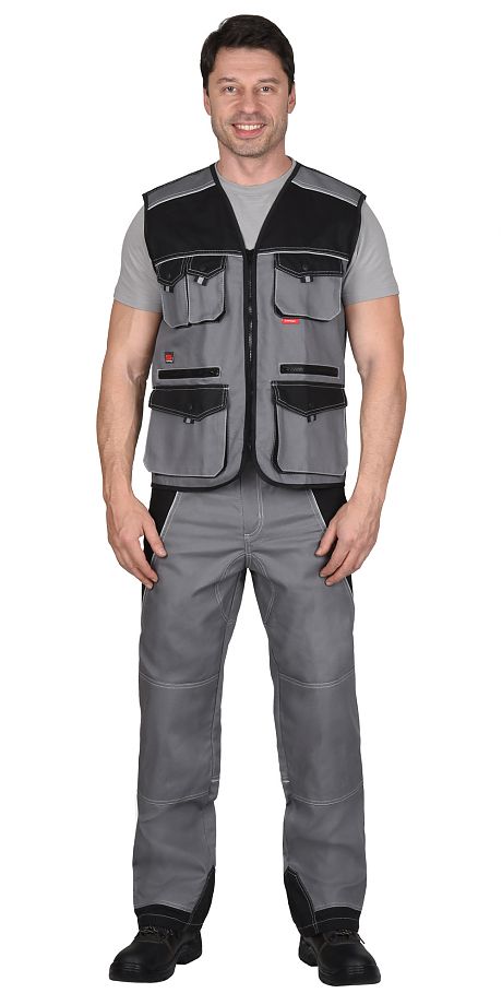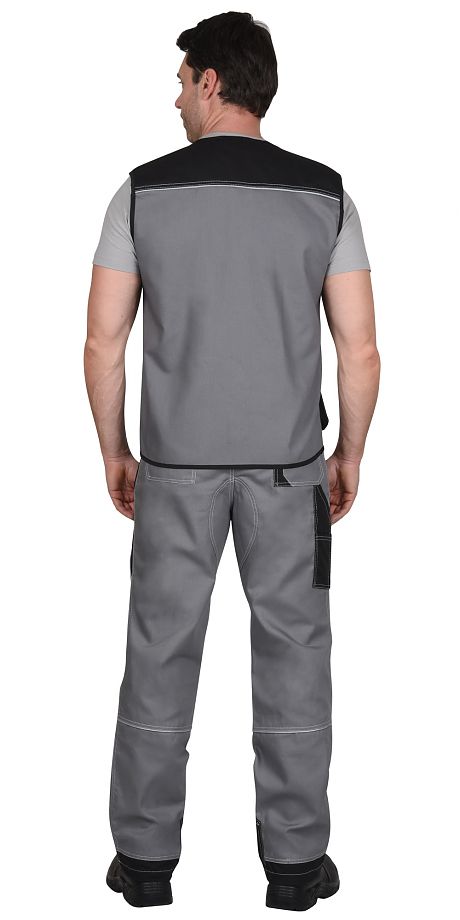 Жилет с центральной застёжкой на тесьму - «молния», с V- образным вырезом горловины, с отрезными кокетками, с накладными верхними карманами с объёмом и фигурными клапанами застегивающиеся на кнопку, с СВ кантом. В жилете по пройме и по всему контуру используется тесьма окантовочная.