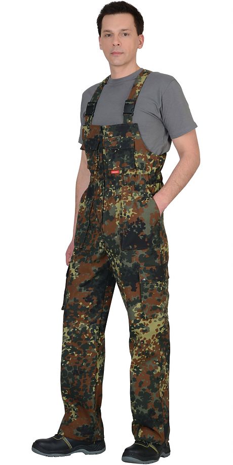 Полукомбинезон прямого покроя; с регулируемыми за счёт эластичной тесьмы и фастексов бретелями; с центральной застёжкой на тесьму - «молнию»; цельнокроеными нагрудником и спинкой; двумя нагрудными накладными объёмными карманами с клапаном, застёгивающиеся на 1 кнопку; кулисой по линии талии с эластичной тесьмой; боковыми накладными полуобъёмными карманами с наклонным входом; двумя нижними накладными полуобъёмными карманами с клапаном, застёгивающимся на 2 кнопки. Низ каждой из половинок полукомбинезона стянут шляпной резинкой, выходящей через две блочки подгибки низа (у боковых швов) и регулирующейся при помощи двойного фиксатора-стопора. Ткань верха: смесовая с ВО пропиткой; состав: 65 % - п/э, 35 % - х/б ТУ 8550-001-81391241-2008