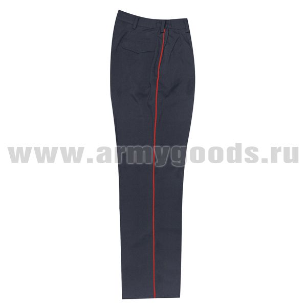 Брюки классические с красным кантом по боковому шву. Объем пояса регулируется боковыми участками с эластичной тесьмой. На поясе- 6 шлевок под ремень. Два боковых кармана. Один карман прорезной с клапаном на задней половинке брюк.