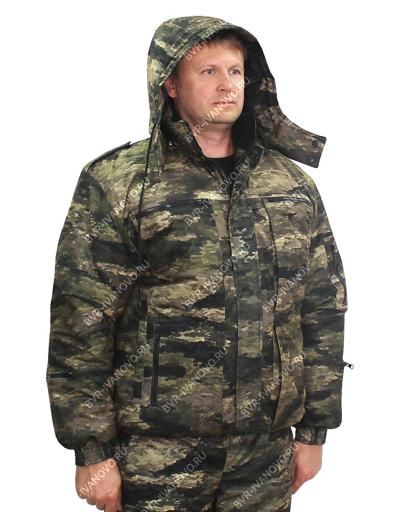 Зимний утепленный костюм "БВР" состоит из полукомбинезона и куртки. Куртка укороченная на притачном поясе, стянутом эластичной тесьмой, воротник-стойка с внутренней флисовой отделкой, с центральной застежкой на тесьму-молнию, прикрытую ветрозащитным клапаном на липучках. Отстёгивающийся капюшон на молнии. Имеет два нагрудных объемных кармана с клапанами. Два нижних кармана защищены клапанами на липучках. Рукав втачной, по низу стянут эластичной тесьмой и регулируется застежкой-липучкой. Полукомбинезон с застежкой на тесьму молнию, нагрудным карманом на молнии, и нижними боковыми карманами с отрезным бочком. Бретели с карабинами для регулировки по росту. ГОСТ 25295-2003